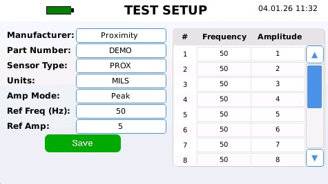 In this mode, the user manually sets vibration frequency and amplitude while the system provides live feedback on measured vibration level, sensor sensitivity, displacement, harmonic distortion, and amplifier load. This closed-loop approach allows users to confidently verify sensor performance and system response under real mechanical excitation.