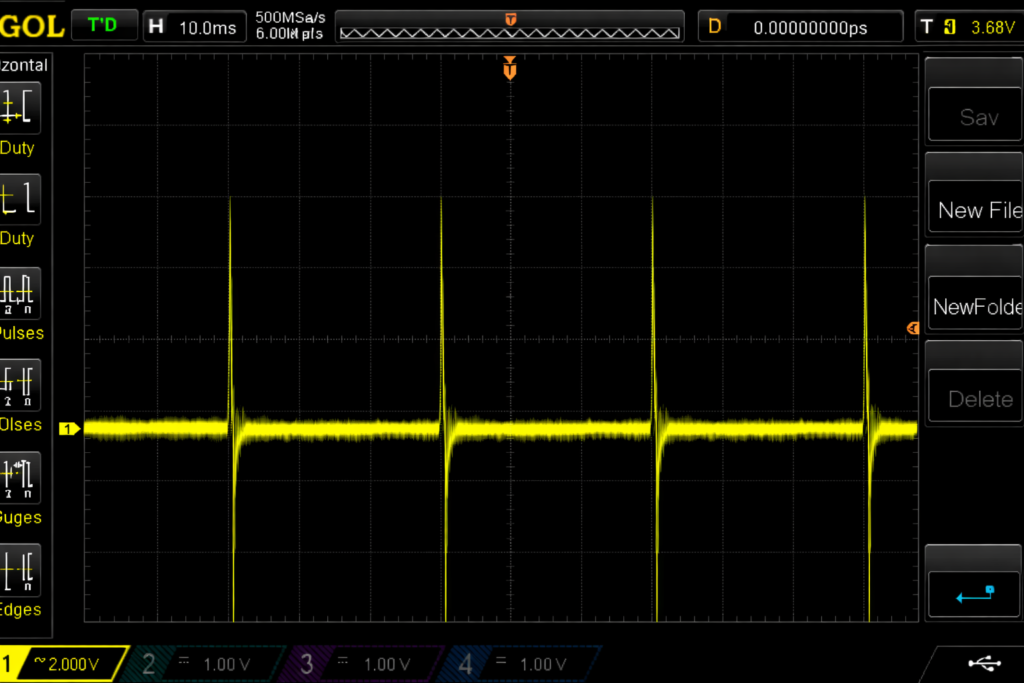 When viewed over a longer time scale, the impulses repeat at a consistent interval. Each event represents a rolling element passing over the same defect, producing a stable and repeatable fault pattern. The spacing between impulses corresponds to the bearing fault frequency, allowing condition monitoring systems to respond as they would to an actual damaged bearing.