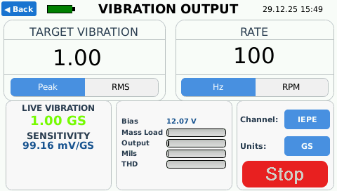 Vibration Output mode is used for manual vibration testing with real-time measurement of actual shaker output. Rather than assuming vibration levels based on drive settings, the AT-2040 continuously measures true mechanical motion using its internal reference sensor.