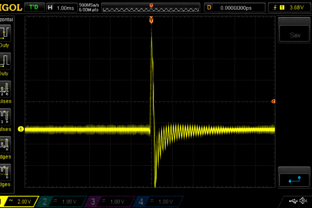 The oscilloscope captures shown below illustrate the waveform characteristics produced by the AT-2040 Gen 2 bearing fault simulation.